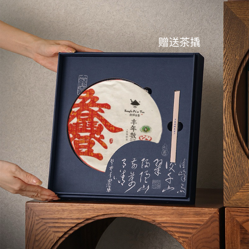 The new Chinese-style gift box features the calligraphic "Fu" (Blessing) character totem, with the tea cake supported by silk, symbolizing the traditional wisdom that "to store tea is to store blessings."
