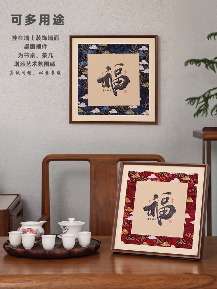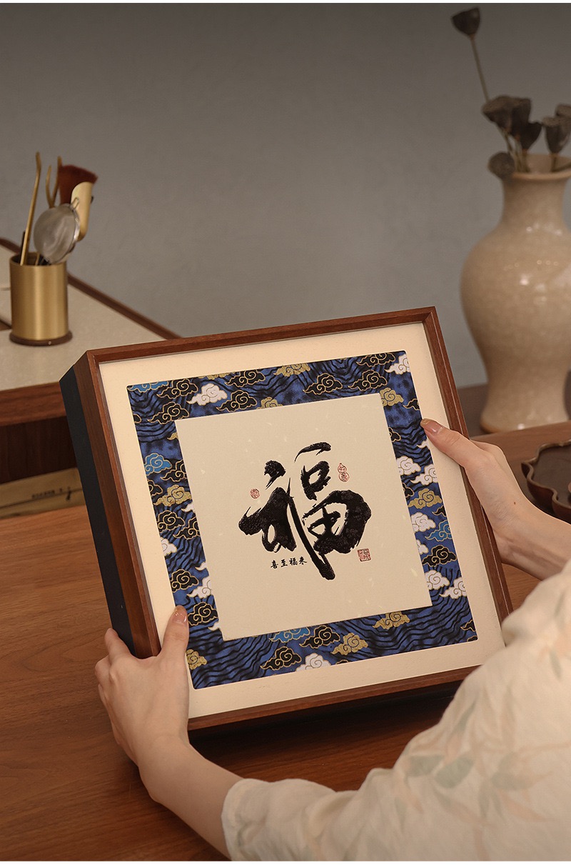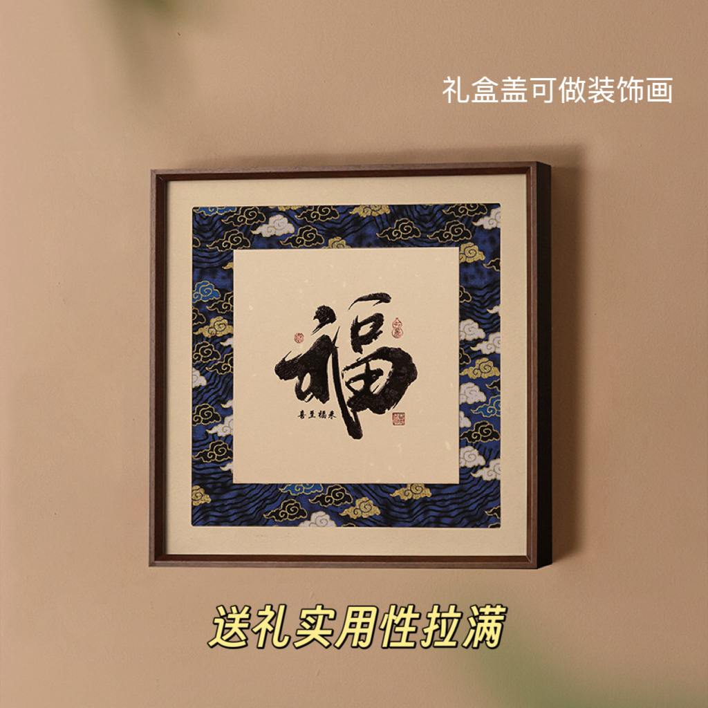 新中式礼盒镶嵌书法字「福」字图腾,丝绸托举茶饼,喻示「藏茶即藏福」的传统智慧。