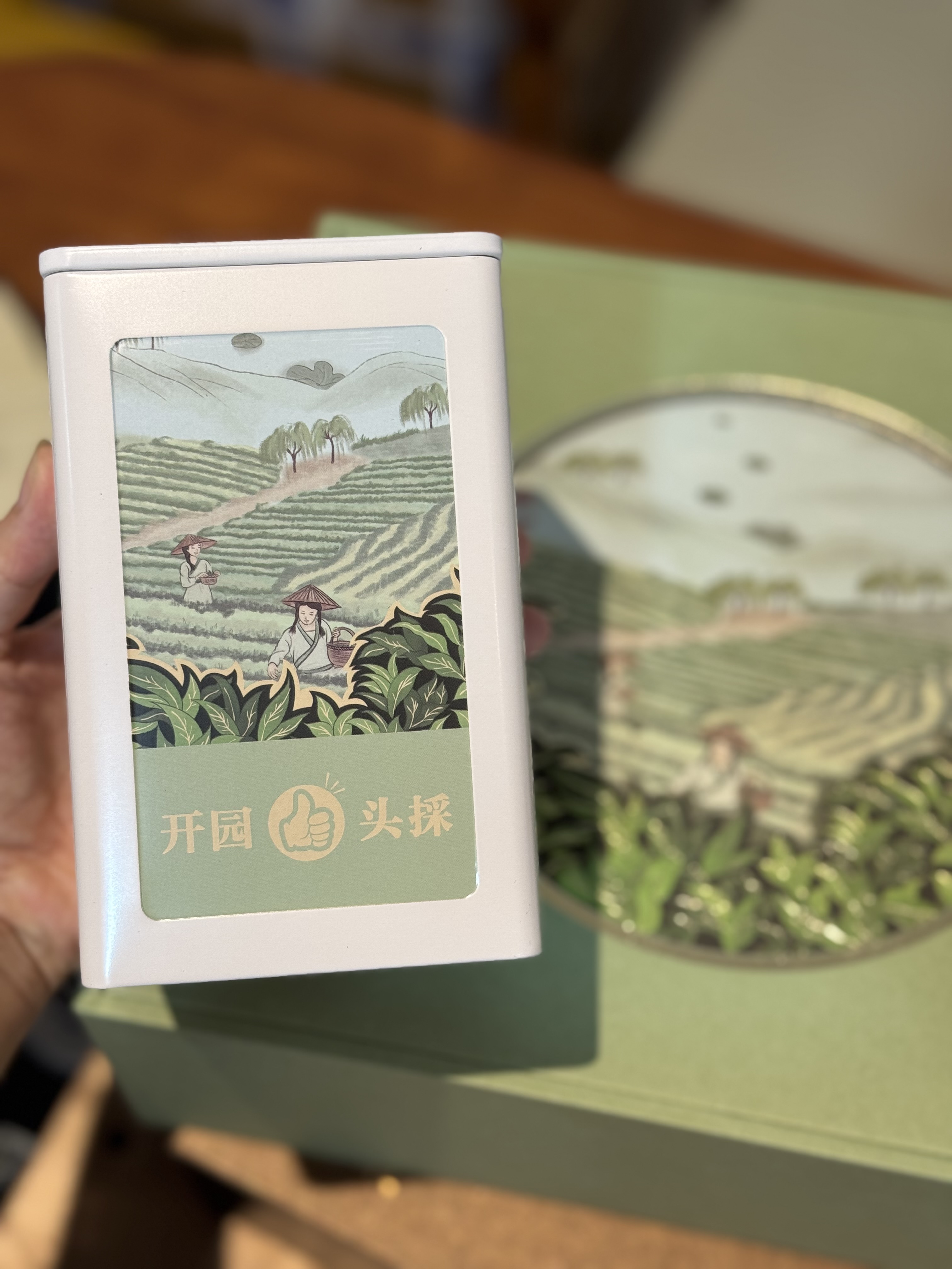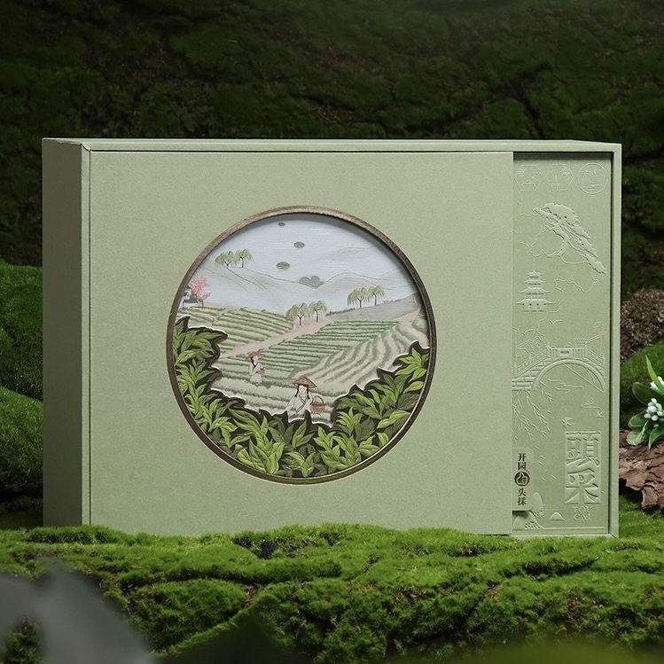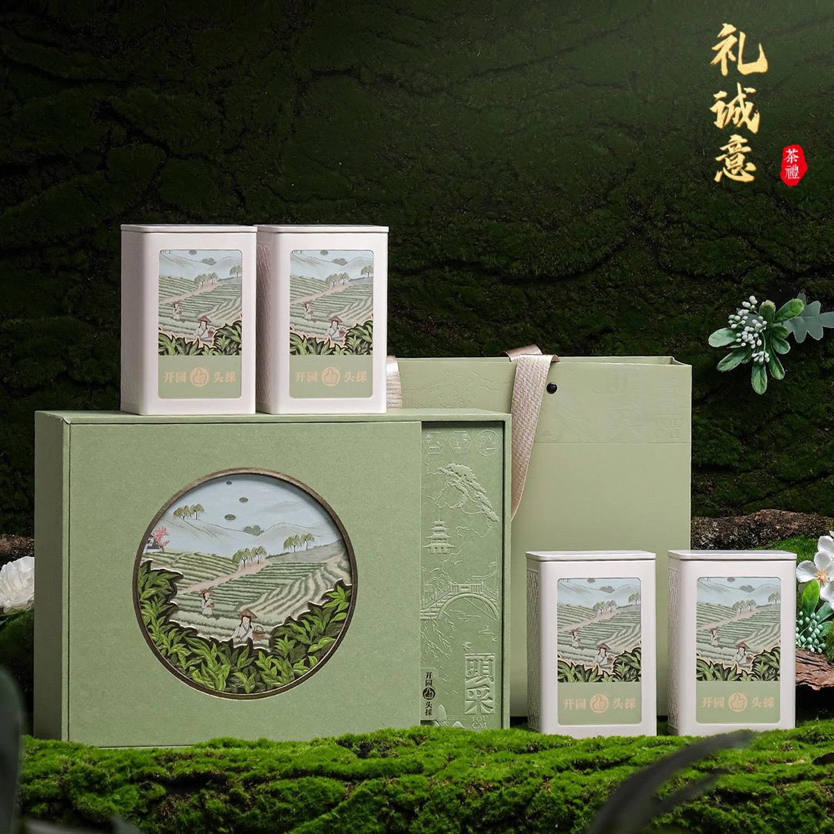 这款礼盒以清新淡雅的浅绿色为笺,勾勒出一幅远山如黛、采茶人于云雾缭绕的茶山间辛勤劳作的画卷。