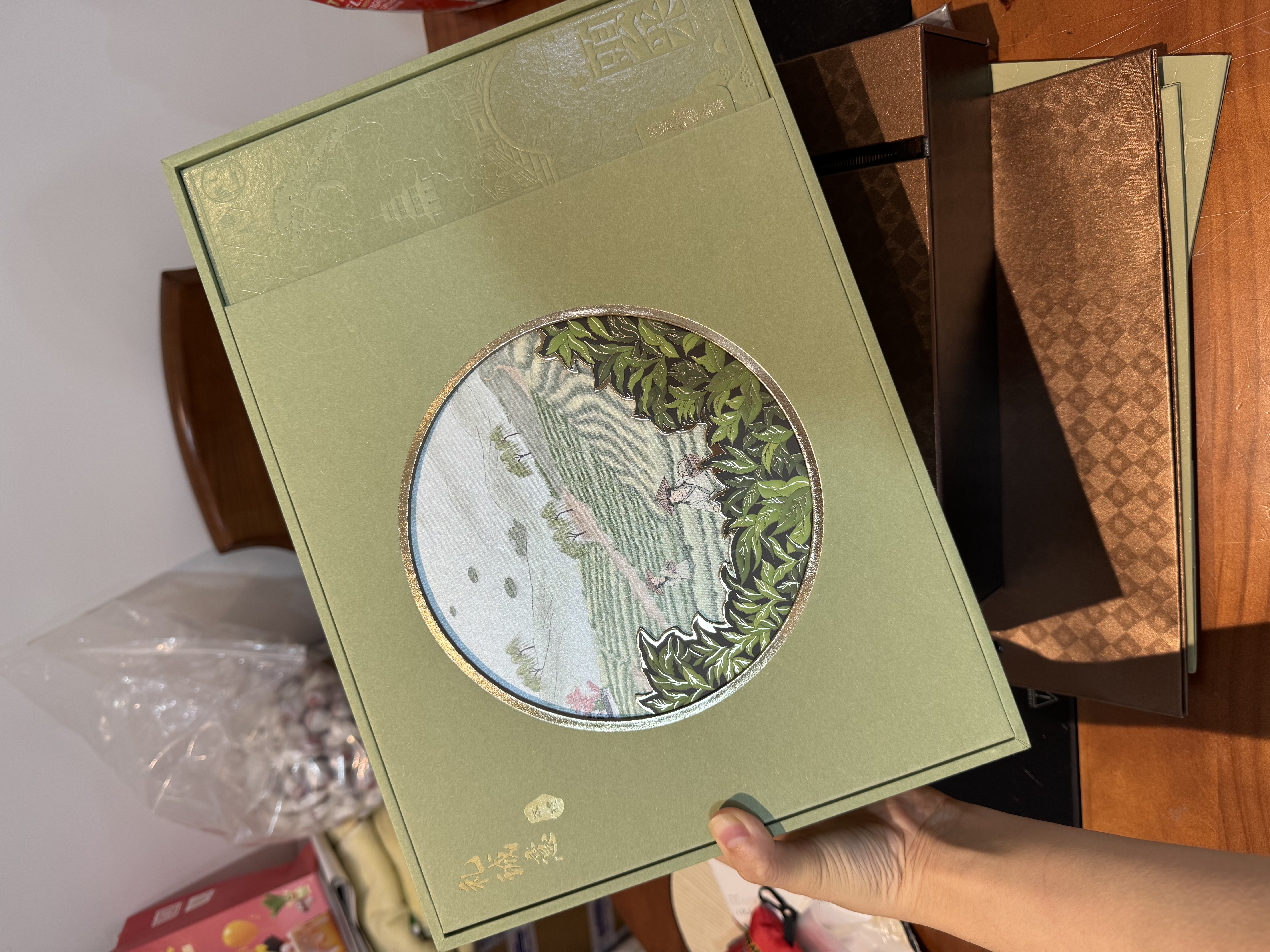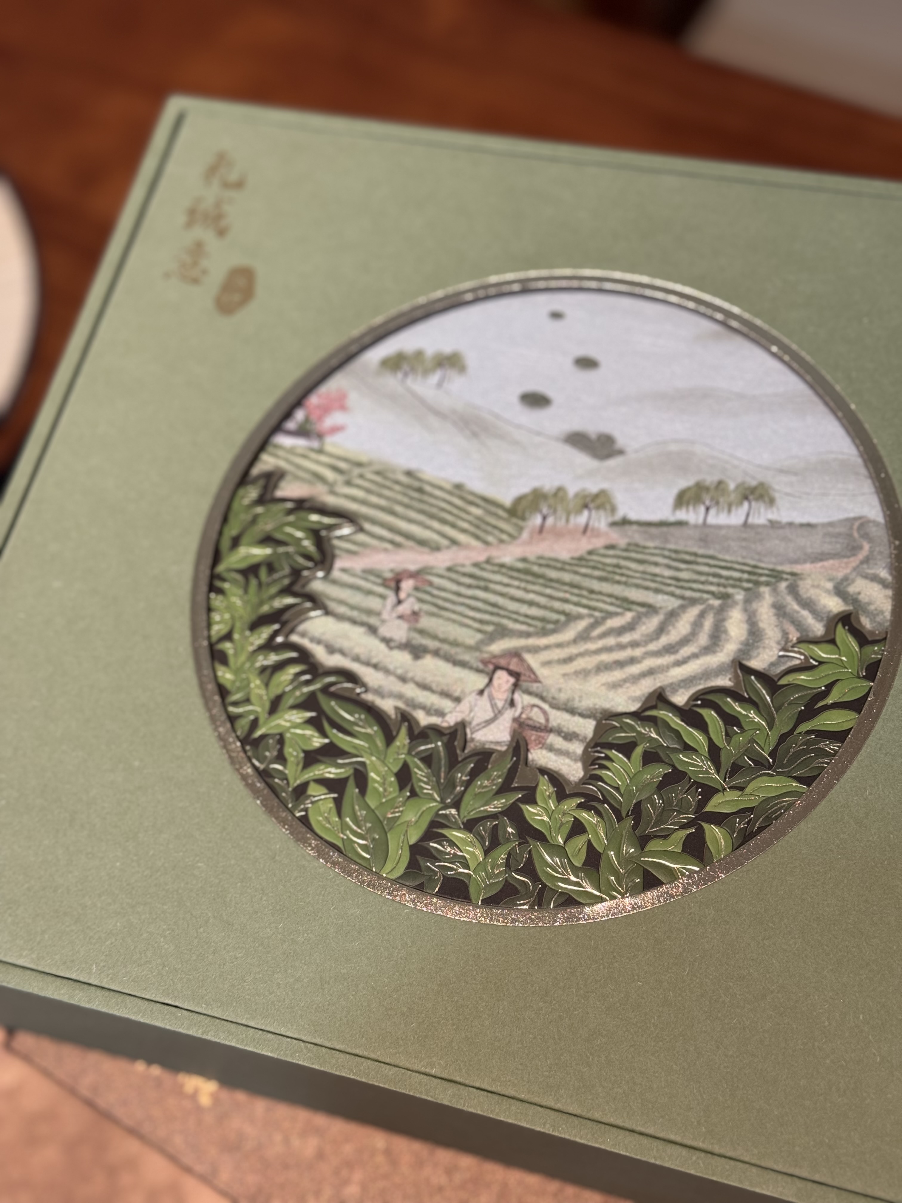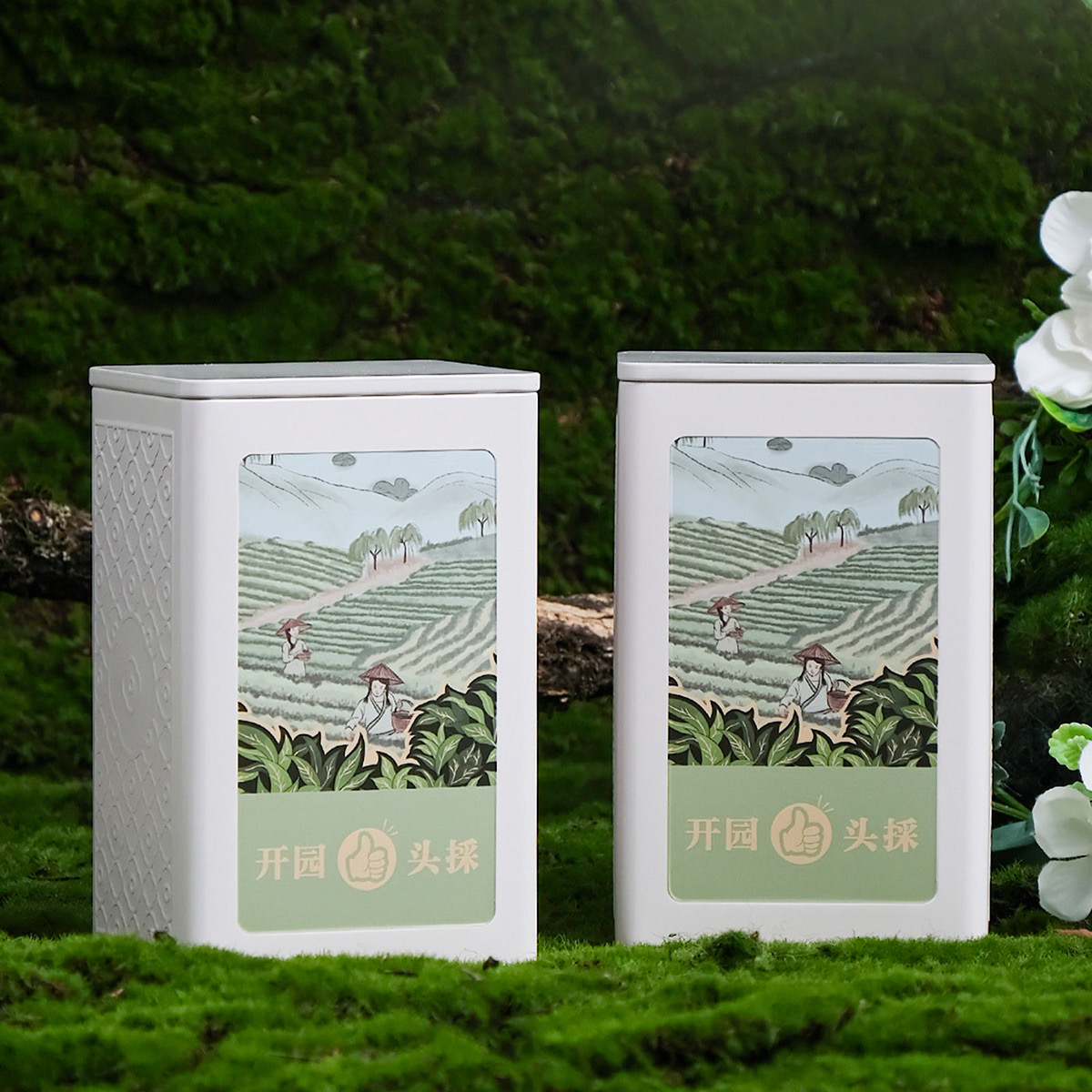 这款礼盒以清新淡雅的浅绿色为笺,勾勒出一幅远山如黛、采茶人于云雾缭绕的茶山间辛勤劳作的画卷。