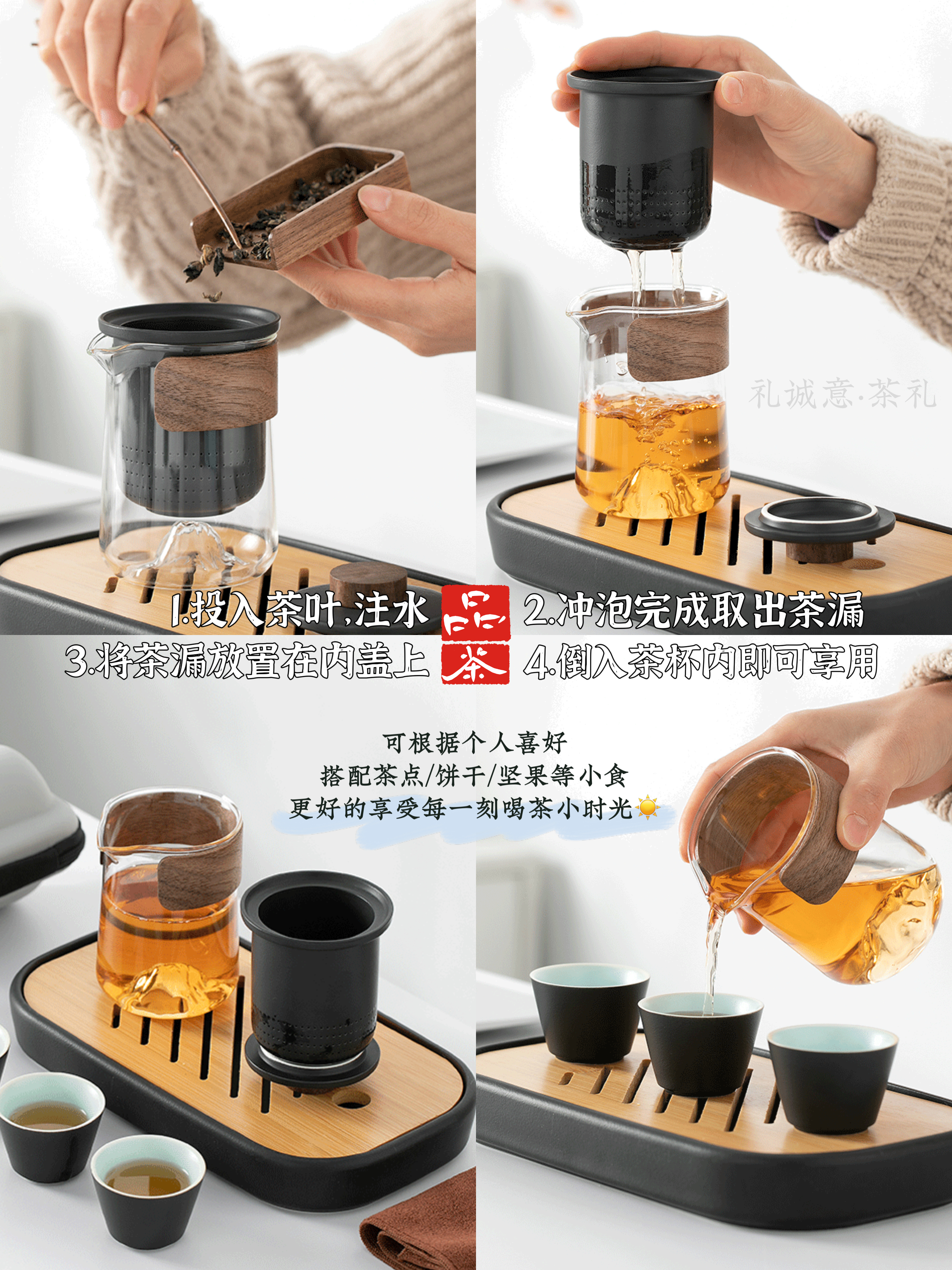为防止烫手便于倒茶汤,特别采用木片贴合包裹,让整个品茶工序自然而有品质