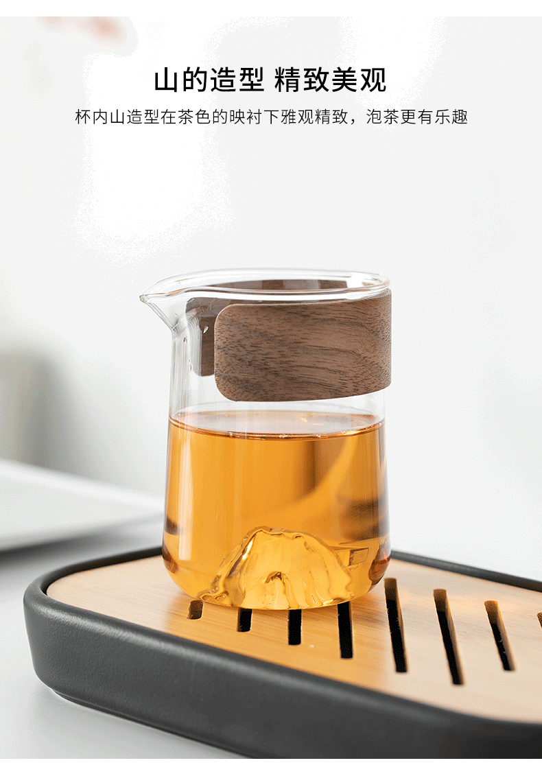 1. Glass Yuanshan Cup: The transparent glass allows you to watch the tea leaves gracefully swirl in the water. The base features a Yuanshan design, adding a sense of tranquility to tea drinking and enhancing the overall atmosphere. To prevent burns and make pouring tea easier, it comes with a wooden wrap, making the tea-drinking experience natural and refined.