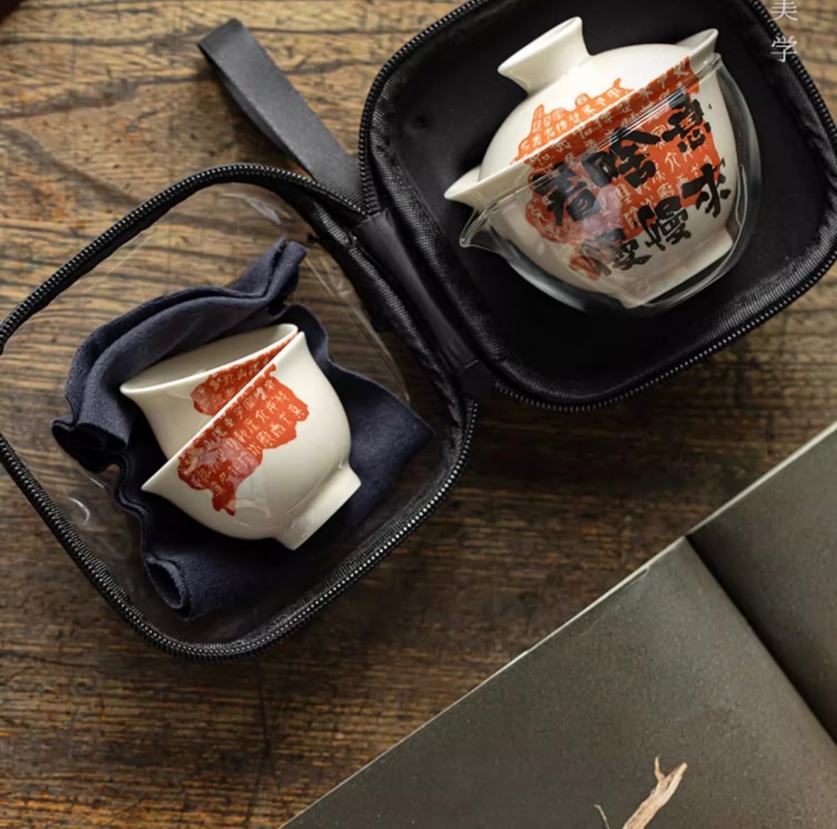 适合出差/办公室自饮茶时使用 茶具包含: 陶瓷艺术盖碗*1个 玻璃公道杯*1个 主人杯*1个 茶巾*1条 收纳包*1个